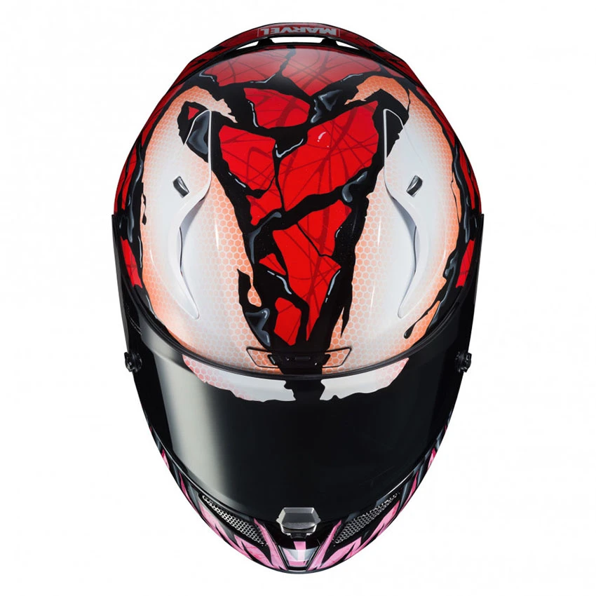 The Carnage graphic is just the latest of the much-anticipated villain graphics added to the Marvel/HJC lineup. Complete with a premium gloss finish and a touch of metallic flake throughout the bright red and black accents of the helmet design. The RPHA 11 is designed for the racetrack with an aerodynamic shell structure composed of HJC’s Premium Integrated Matrix (P.I.M. Plus) shell material for enhanced shock-resistance in a lightweight helmet.