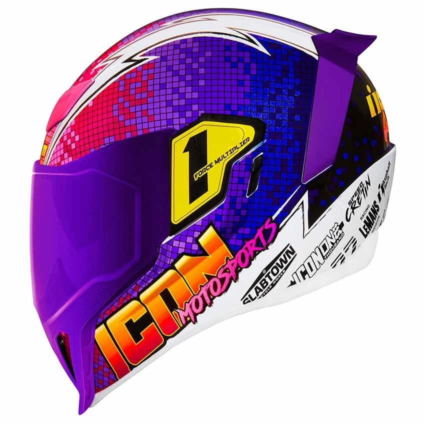 The Icon Airflite Quarterflash motorcycle helmet’s ventilation system consists of strategically placed air vents, intakes, air channels and exhaust ports. The oversized chinbar intake enhances airflow, keeping you cool by routing air where you need it most. A decrease of both drag and weight was achieved by sculpting the traditional neckline of the Icon Airflite to avoid jacket or suit interference.