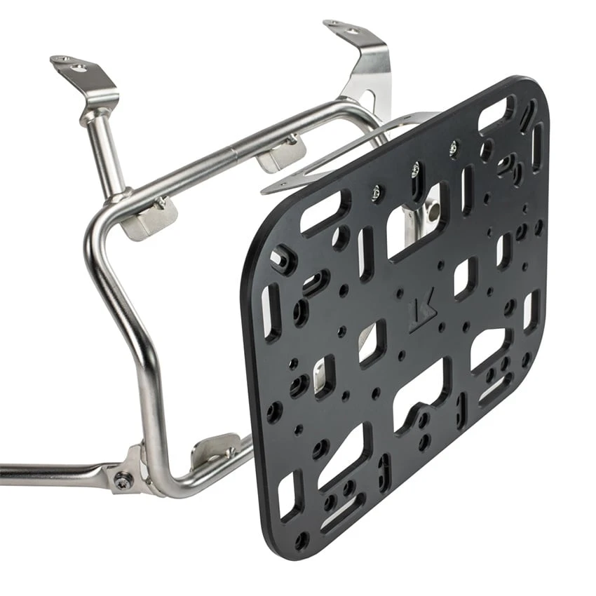 BMW Motorrad GS ADVENTURE pannier frames are designed to mount aluminium cases and do not have a standard flat profile on the exhaust side. This special edition OS-PLATFORM includes a stainless steel adaptor to flatten the profile and provide a strong mounting location for the OS-PLATFORM, which then gives you the option to mount Kriega ‘Soft Luggage’.