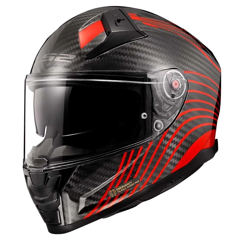 Multiple layers of LS2′ exclusive wide-weave carbon fiber for a very light weight, strong shell that handles tough impacts and disperses energy for a safer ride. The geared vison system is designed to provide effortless, smooth operation of the outer visor and sun visor while riding. The metal design delivers maximum durability and allows for quick and easy tool-less installation and removal.