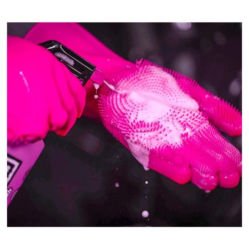 Just spray on the Muc-Off bike cleaner or snow foam either onto the area to be cleaned or directly onto the gloves and get scrubbing.