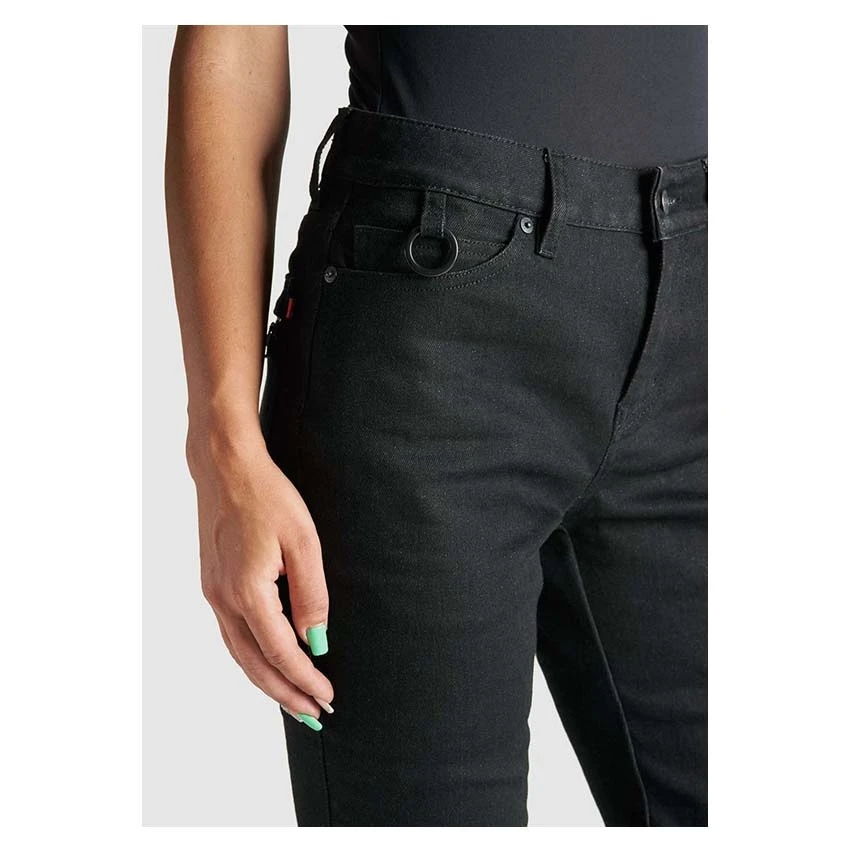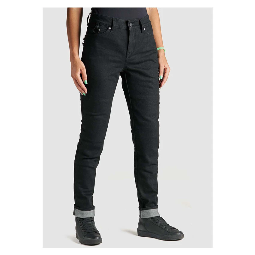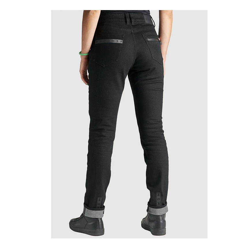 Single layer women’s motorcycle jeans made of 13oz super-stretch Armalith® material. An abrasion resistant and highly heat-conducting fabric. The Pando Moto Kissaki Arm is standard delivery with level 1 protectors on the knees and hips. This jeans has a slim fit and regular waist, with a reflective print on the cuffs for better visibility. Â