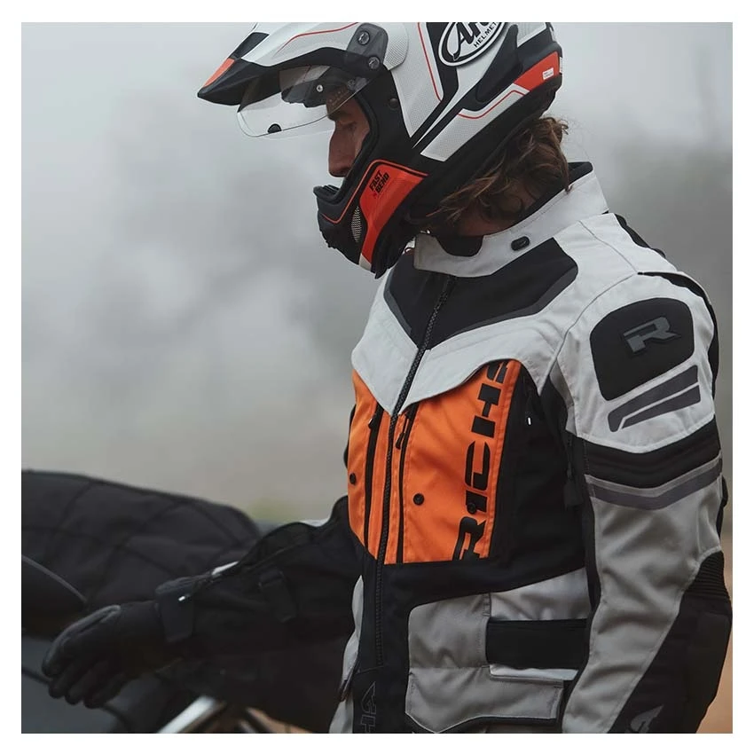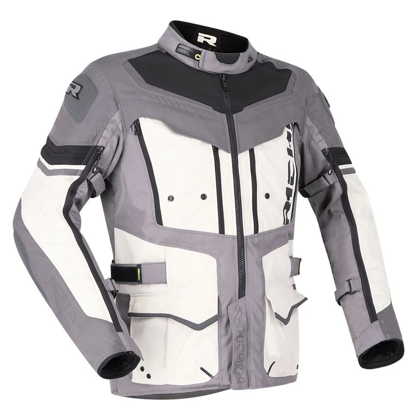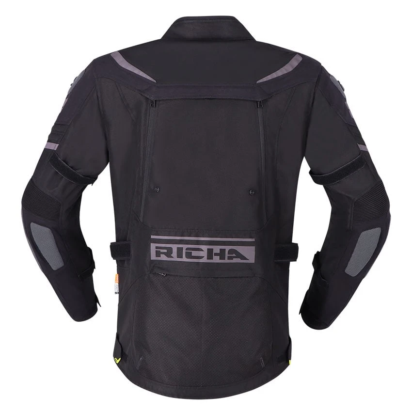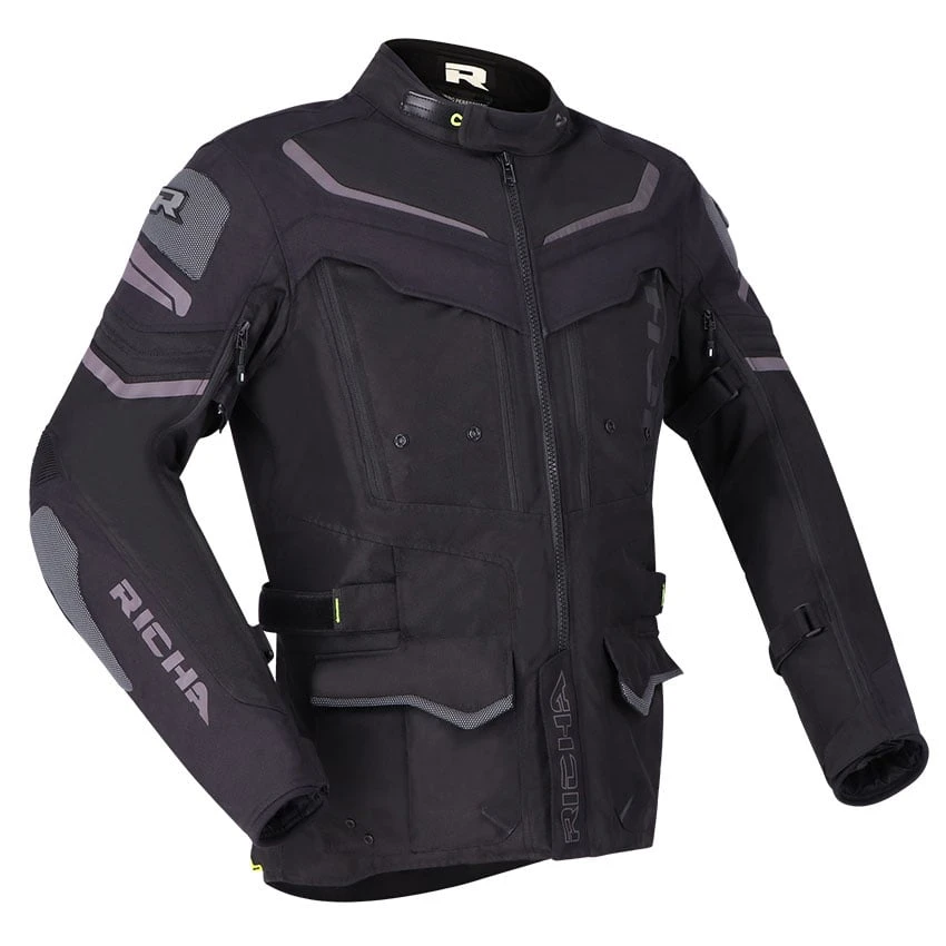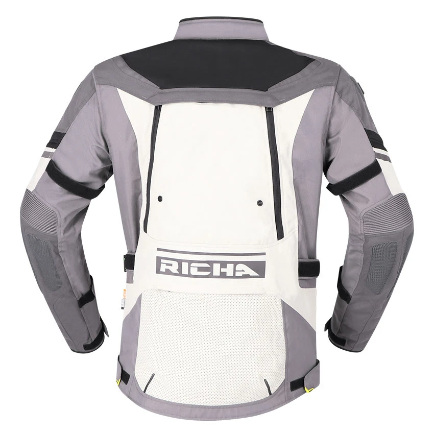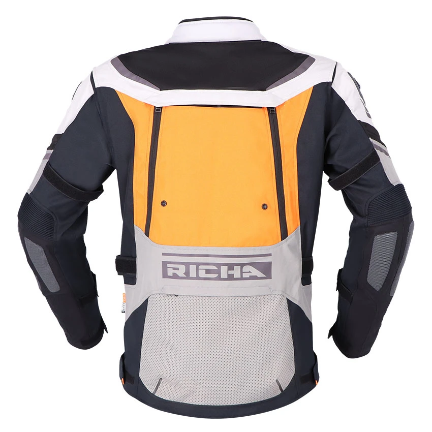 The Richa Infinity 2 Adventure textile motorcycle jacket is the ideal jacket for adventure and tour use. Manufactured from abrasion-resistant 600D Cordura, Suprfabric and high-density air mesh panels. The waterproof Aquashell LTD membrane is removable for days you don’t need it. The Infinity 2 Adventure has fixed ventilation, but also adjustable ventilation in key areas. On the chest, you will find foldable ventilation panels. This motorcycle jacket comes standard with protectors on the elbows, shoulders and back. Several features have been added for improved comfort, such as stretch panels, connection zipper, adjustment options and multiple storage pockets.