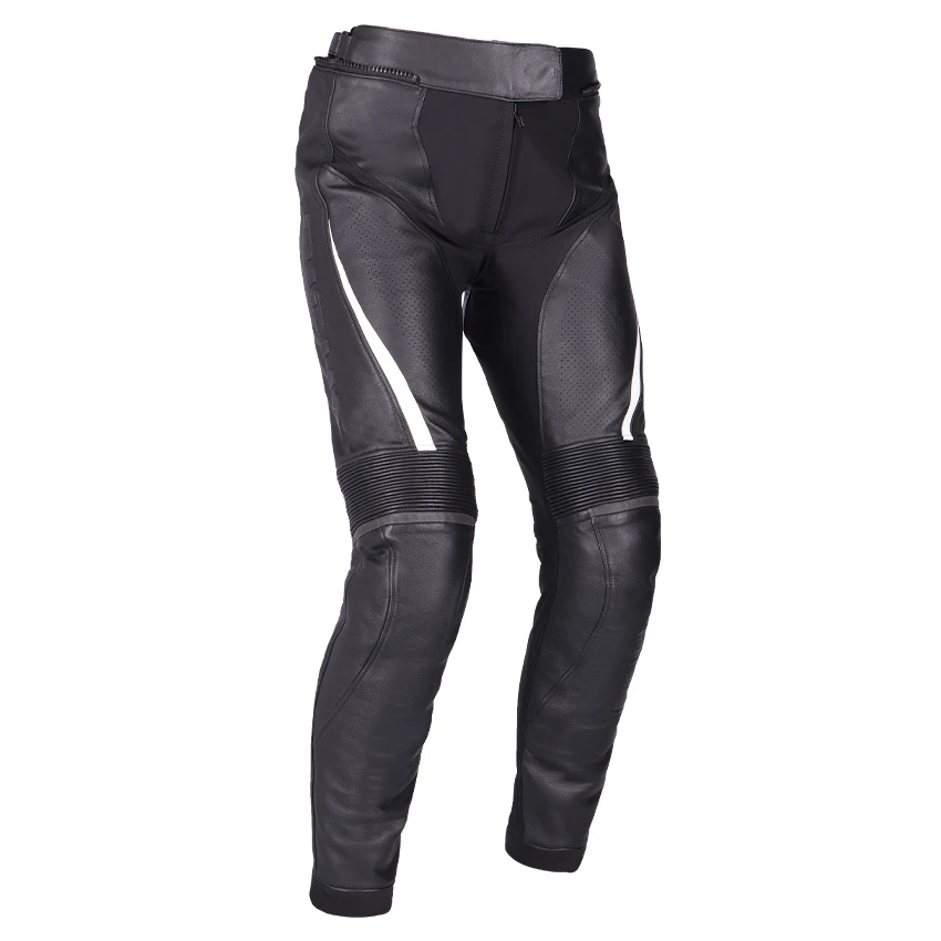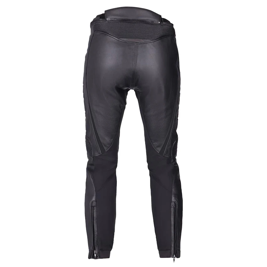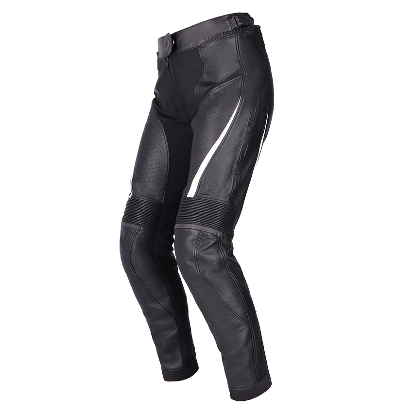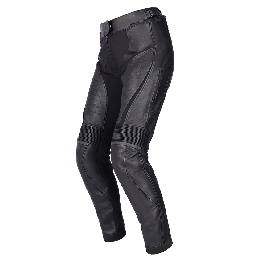 The Laura from Richa is a sporty leather ladies motorcycle pants. Made from premium cowhide leather with light perforations on the front and back for optimal ventilation in warm weather. The strategically placed stretch panels provide an ergonomic slim-fit fit. Safety stitching in risk zones and standard with D3O protection on the knees and (optional) prepared for hip protection.