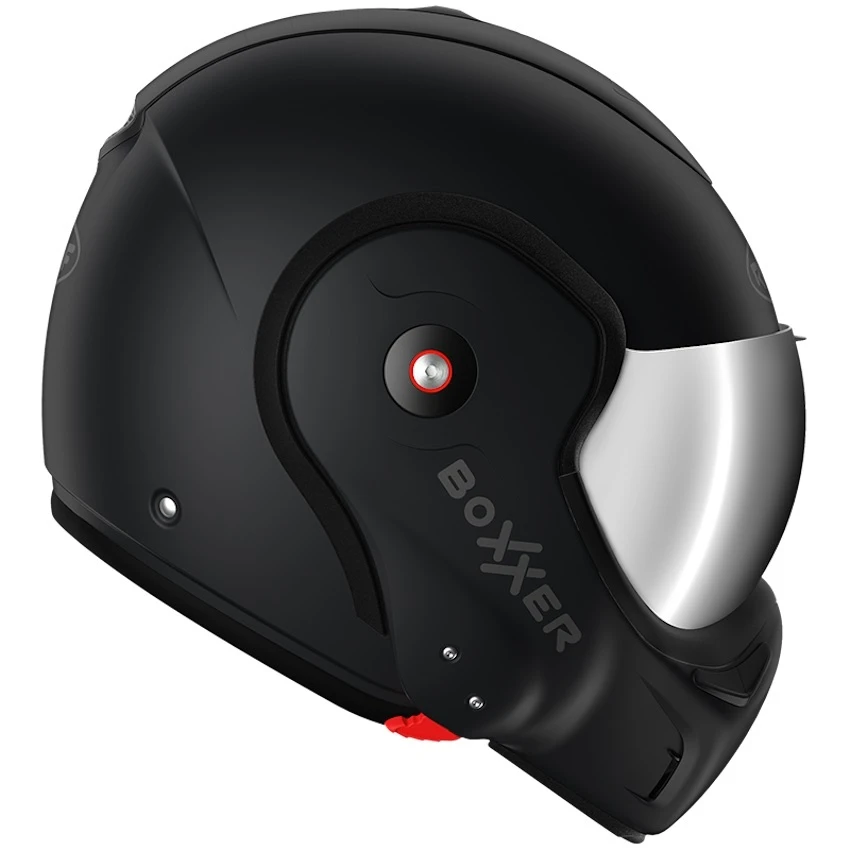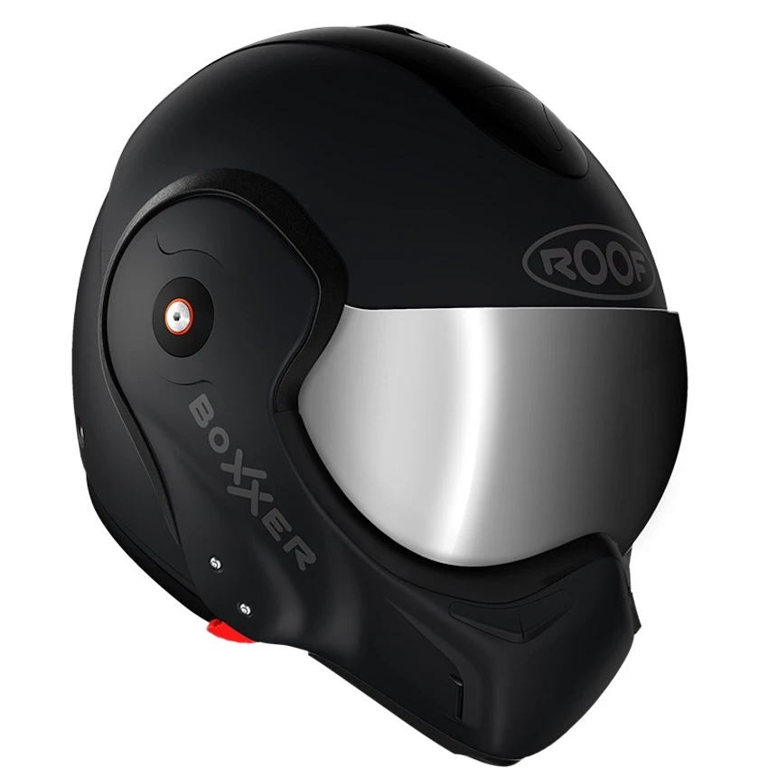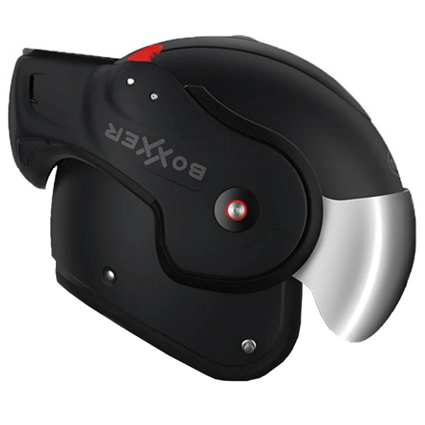 The unique new BoXXer with extra silver iridium visor and a real Roof tube. So you will recieve 2 visors: besides the standard clear visor a silver iridium visor is included. The Black Shadow has all the innovations of the BoXXeR: 180° foldable chin, approved as a jet and integral helmet, automatic chin lock, perfect seal with visor, quick-drying silent lining…