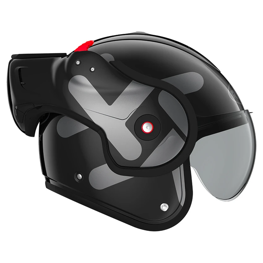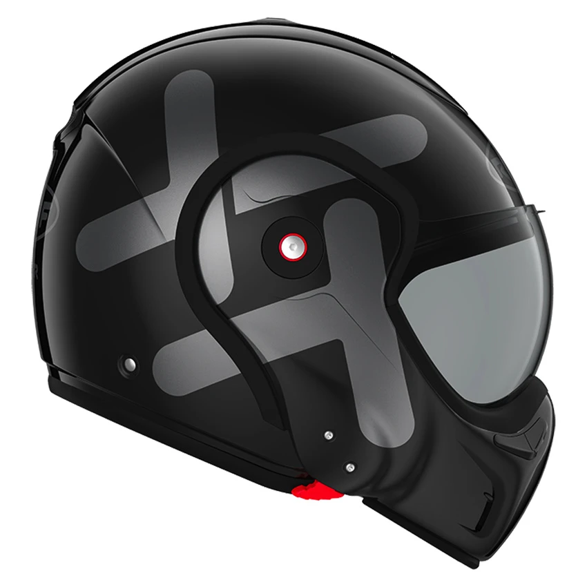 The helmet retains its double inspection of jet and system helmet but also gets the ‘silent lining’ as we know it from the Roof Desmo. In addition, you lock and unlock the chin with one hand!