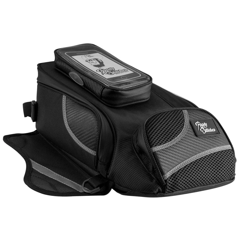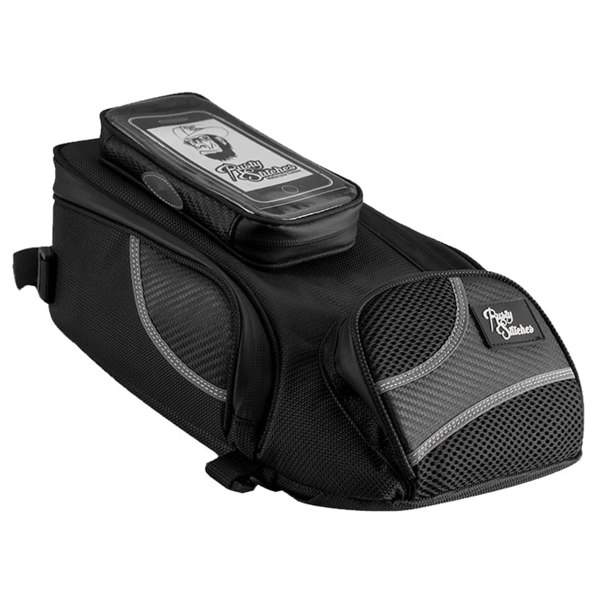 The Rusty Stitches James Senior tank bag has a number of magnets that ensure that the bag fits and stays on almost every tank. Comes with a waterproof cover and a special shoulder strap. With this shoulder strap you can transform the tank bag into a backpack in no time.
