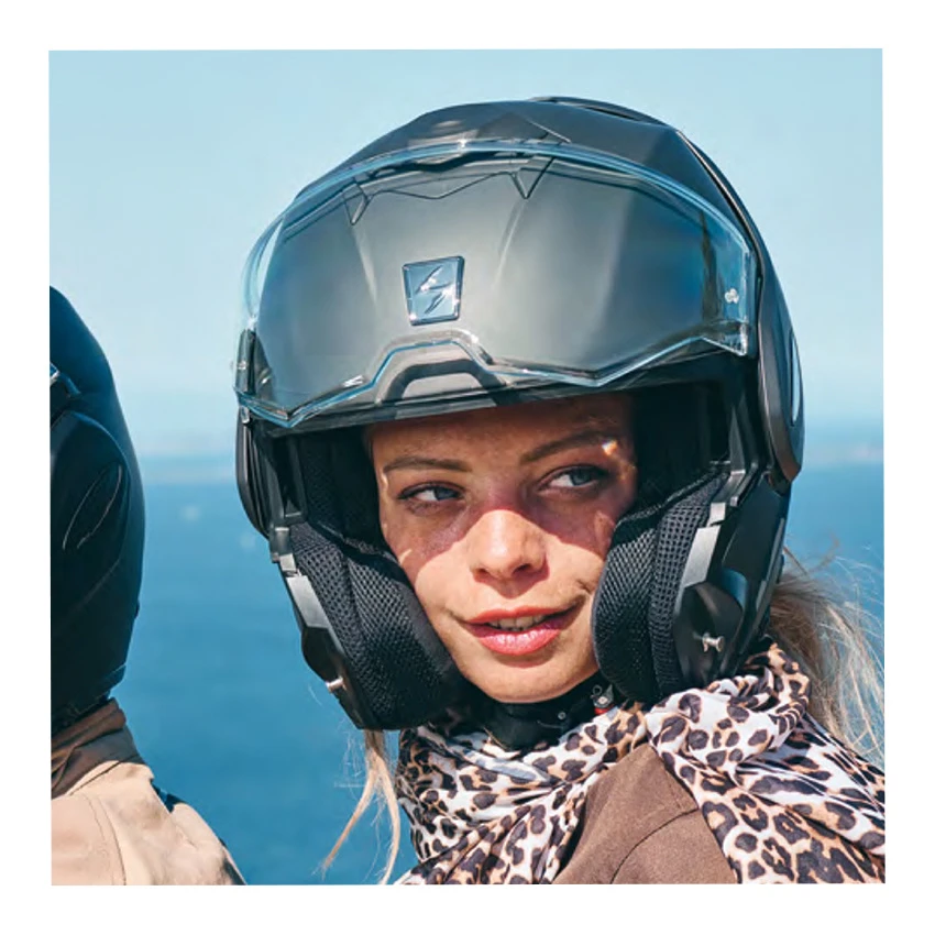 The first system helmet from Scorpion where the chin piece can be fully folded backwards. The chin piece falls away aerodynamically in the helmet so that it does not catch any wind, ideal if you like to ride at higher speeds. Even when it is folded backwards, the visor keeps your eyes protected against insects and dirt. This helmet is also equipped with an integrated sun visor, an anti-scratch outer visor, pinlock and removable and washable lining.