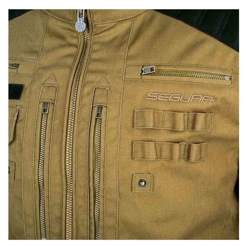 Waterproof textile motorcycle jacket from Segura, the Fergus has some traditional details that give this jacket a light retro-vintage-military-classic style. Made of robust Serica fabric combined with Segura’s waterproof membrane. The 90g thermal lining allows you to easily adapt this jacket to the current weather conditions. The Fergus motorcycle jacket comes standard with an Alpha level 1 protector on the shoulders and elbows, and if desired, you can insert a back protector into the designated pocket on the back.