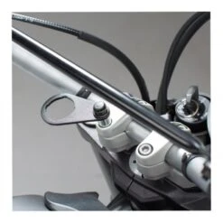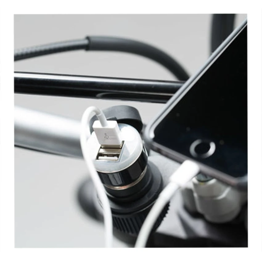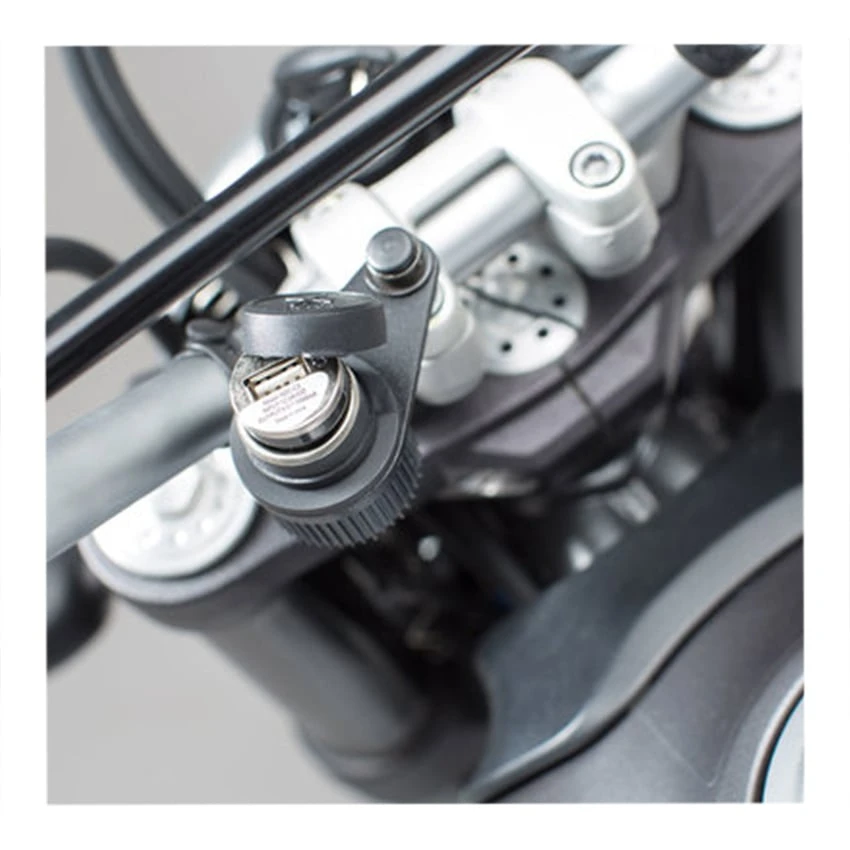 The cigarette lighter outlet of the universal electronics kit connects directly to the bike’s power system. You can charge your smartphone or GPS device using the included USB adapter. The mounting bracket can be attached to virtually any handlebar using the M8 and M10 screws included in the kit. Alternatively, you can install the power socket on your bike’s fairing.