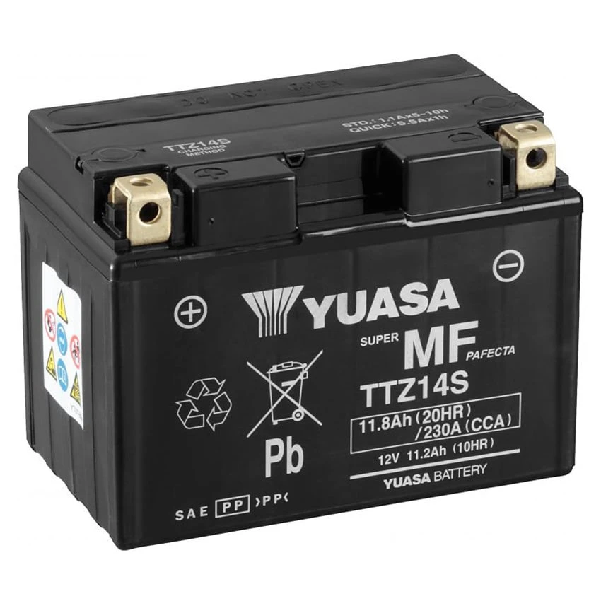 The Yuasa TTZ14S motorcycle battery has a voltage of 12V, a capacity (20H) of 11.2 Ah and a starting capacity of 230 A (CCA). The dimensions are 150 mm long, by 87 mm wide and 110 mm high. 100% maintenance free, high vibration resistance, good cold temperature resistance and ideal for seasonal use.